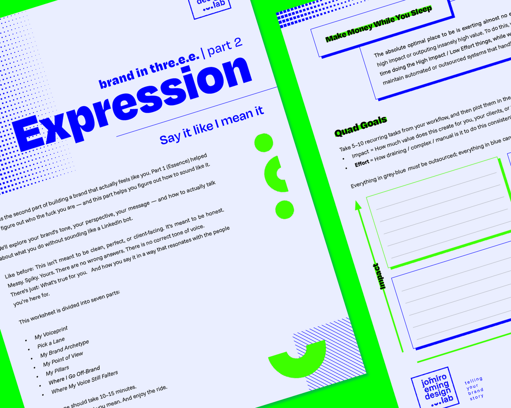 - Expression – how you sound, what you stand for, and how to talk about your work without sounding like a LinkedIn bot