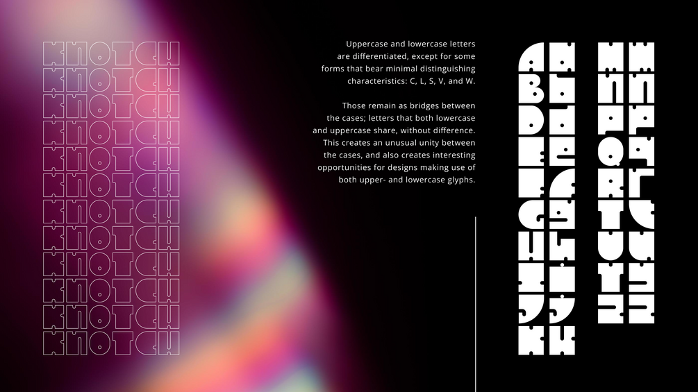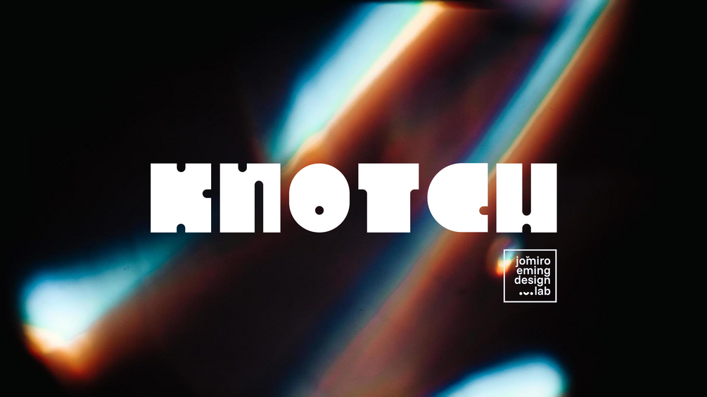 Knotch is a modular display typeface born from the intersection of geometry and play. Built on a strict grid, its glyphs are carved from perfect circles and quarter-rounds, each one interrupted by a precise notch or dot. These interventions aren’t decorative; they are the logic of the system, the negative space that defines the positive form.
